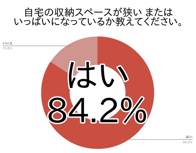 今回のアンケートでは84.2%の方が自宅の収納スペースを狭いと感じる・またはいっぱいになっていると感じていると答えました。