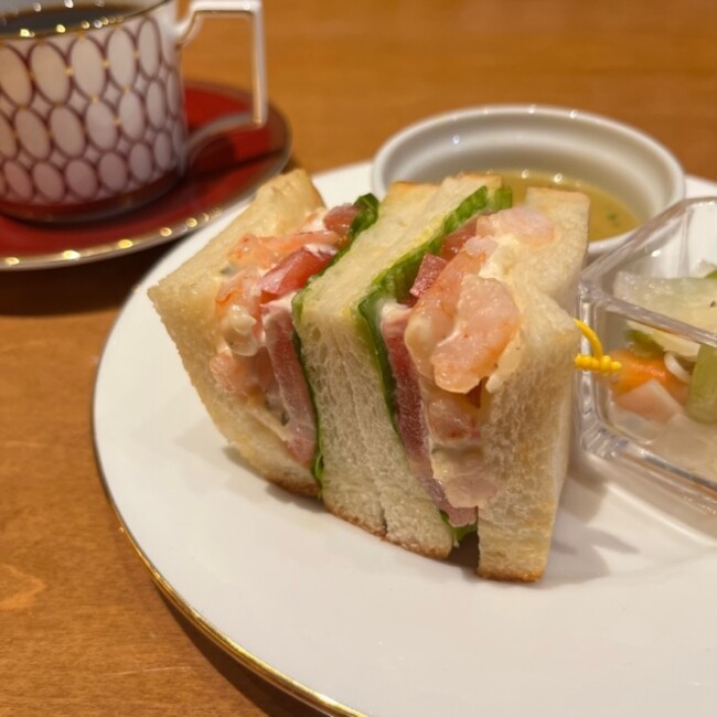 中段には、プリプリの海老を柔らかい酸味の効いたタルタルソースで和え、当店自慢の最高級生食パンで挟んだサンドウィッチと、玉ねぎの甘味とコクのあるオニオンスープ、オリーブオイルのほのかな香りのするさっぱりとしたマリネになっております。