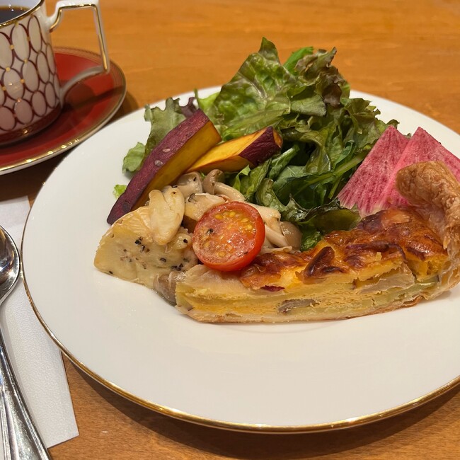 《 彩りサラダ・カマンベールチーズときのこのソテー・りんごとさつまいものキッシュ》