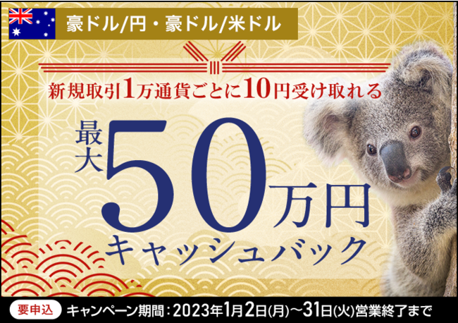 セントラル短資FX株式会社(本社:東京都中央区、代表取締役社長:松田 邦夫)は、2023年1月2日から 31日まで豪ドル/円と豪ドル/米ドルの新規取引を対象としたキャッシュバックキャンペーンを実施します。