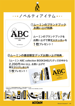 このフェアを開催する店舗では、宝島社ブランドブック『MOOMIN 整理上手な12ポケットマルチに使えるポーチ BOOK 〜 ABC collection BOOKSHELF 〜』を1冊お買い上げのお客様に「限定ステッカー(全1種)」を1枚プレゼントいたします。また『ムーミン ABC collection BOOKSHELF』グッズを2,200円(税込)以上お買い上げのお客様には、ノベルティとして「限定クリアしおり(全1種)」を1枚プレゼントいたします。