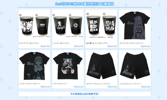 「サーモタンブラー(全3種:エミリア/レム/脳が震える)」「レム オールプリントTシャツ」「ベアトリス Tシャツ」「スウェットハーフパンツ(全2種:エミリア/レム)」