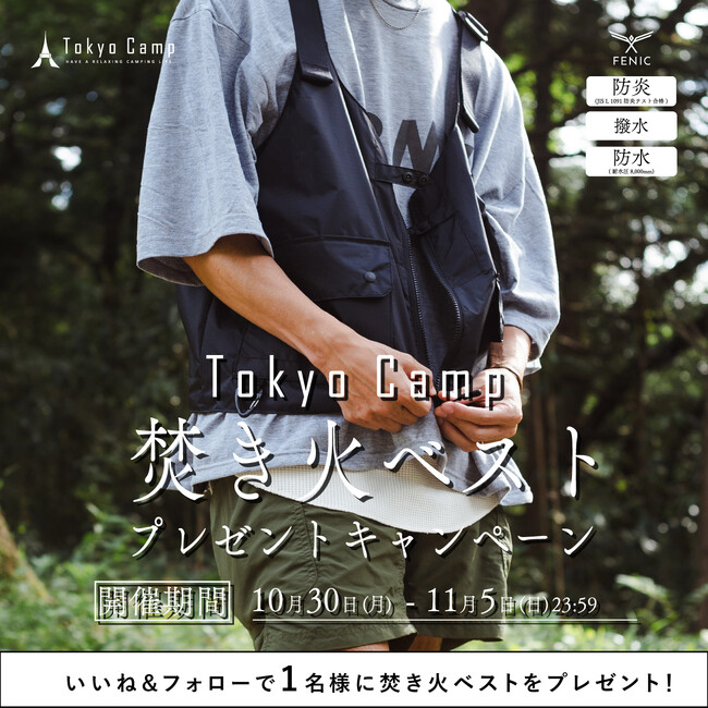 合同会社DRive(本社:大阪府箕面市、代表:吉川了)が運営するキャンプブランド『TokyoCamp(トーキョーキャンプ)』は2023年10月30日(月)から2023年11月5日(日)23:59まで、『公式Instagramにてフォロー&いいねキャンペーンを行います。本キャンペーンでは「TokyoCamp TAKIBI VEST」を1名様にプレゼントします。