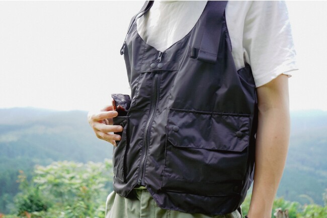 フロントにある2つのポケットには収納物の落下を防ぐスナップボタンが付いています。左胸部にはサングラスやキャンプギアを掛けられるギアループ、右下腹部には留め具の付いたDカンが備えられています。また、ショルダーベルト付きでお好みのスタイルに合わせて調整いただけます。アウトドアシーンはもちろん、普段使いとしても合わせやすい汎用性の高いアイテムです。