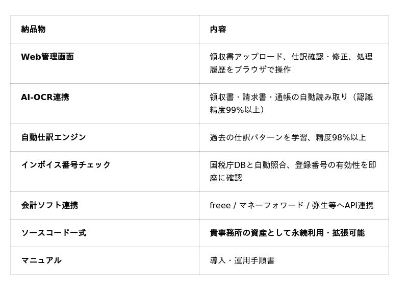 ソースコード・設定ファイル一式を貴事務所に納品。ベンダーに依存せず、永続的に利用可能な自社資産となります。JDL、TKC、MJSなどの「ベンダーロックイン」から解放されます。