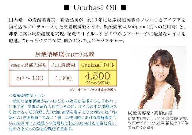 炭酸美容家・高橋弘美プロデュース“炭酸ガス(100%)を高濃度に溶解したオリジナルオイル” 使用