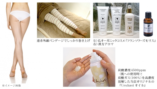 炭酸美容の第一人者・高橋弘美プロデュースの“炭酸ガス(100%)を高濃度に溶解(製造特許出願中)したオイルを使用した経絡マッサージをベースに、女性のボディラインを知り尽くしたプロによるハンドテクニックと、遠赤外線が織り込まれたバンデージ使用のトリプルトリートメント。バンデージは脚の下から上に向かって適度な圧力を加えながら、形を整えていきます。さらに、セルフケアが難しいヒップ部分へ、フランスのオーガニックコスメブランド「フランソワーズモリス コスメティック」を使用したスクラブ&パックケアも。プロの手による繊細なタッチで、うっとりとしたリラクゼーションタイムをお約束いたします。