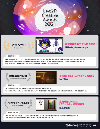 各受賞者による高い品質でオリジナリティ溢れる作品を、Live2D Creative Awards 2021特設サイトよりぜひご覧ください!