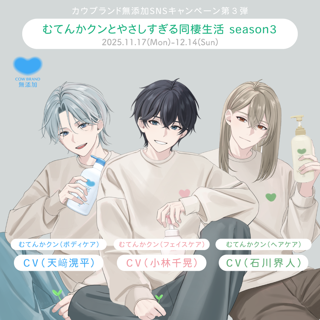 このキャンペーンではカウブランド無添加のキャラクター「むてんかクン」を擬人化(フェイスケアCV.小林千晃さん、ヘアケアCV.石川界人さん、ボディケアCV. 天崎滉平さん)。
