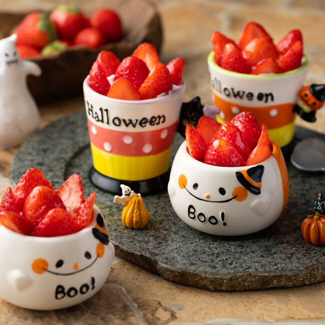 濃厚とろけるかぼちゃプリンに、生クリーム、ミガキイチゴジャムをたっぷりトッピング。コクのあるかぼちゃと甘酸っぱいいちごの味わいが楽しめます。フレッシュいちごをのせたハロウィン陶器カップ入りの特別バージョンは10月29日(土)〜10月31日(月)の期間限定・数量限定販売となります。