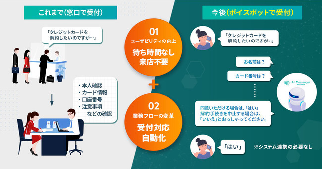 広島銀行では、クレジットカード解約専用ダイヤルを設置し、必要な情報のヒアリングを全てボイスボットとの対話で完結させます。