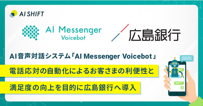 AI対話カンパニーとして対話のDXを推進する株式会社AI Shift(本社:東京都渋谷区、代表取締役社長:米山結人)は、AI音声対話システム「AI Messenger Voicebot」が、電話応対の自動化によるお客さまの利便性と満足度の向上を目的として、株式会社広島銀行(本社:広島市中区紙屋町一丁目3番8号、代表取締役頭取:部谷俊雄、以下広島銀行)に導入されたことをお知らせいたします。