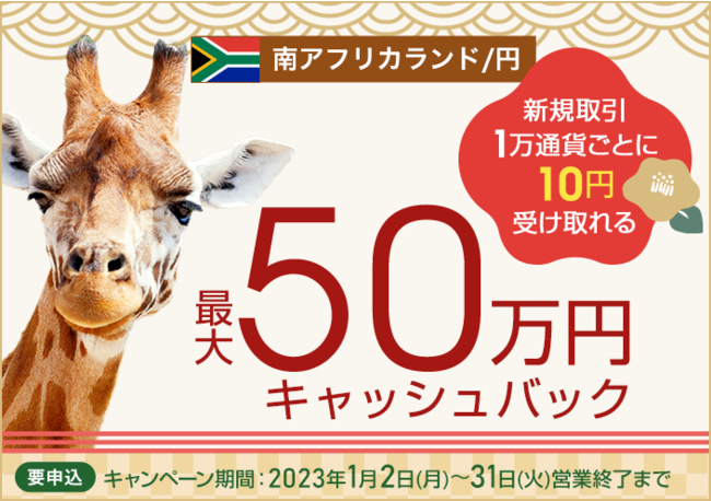 セントラル短資FX株式会社(本社:東京都中央区、代表取締役社長:松田 邦夫)は、2023年1月2日から 31日まで南アフリカランド/円の新規取引を対象としたキャッシュバックキャンペーンを実施します。