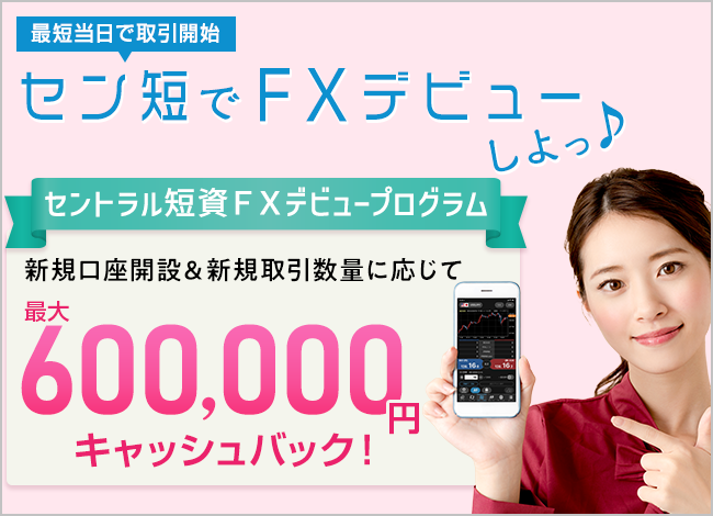 セントラル短資FXで初めて口座を開設されたお客さまに、口座開設月から翌々月末までの新規取引合計数量に応じて、最大600,000円をキャッシュバックします。