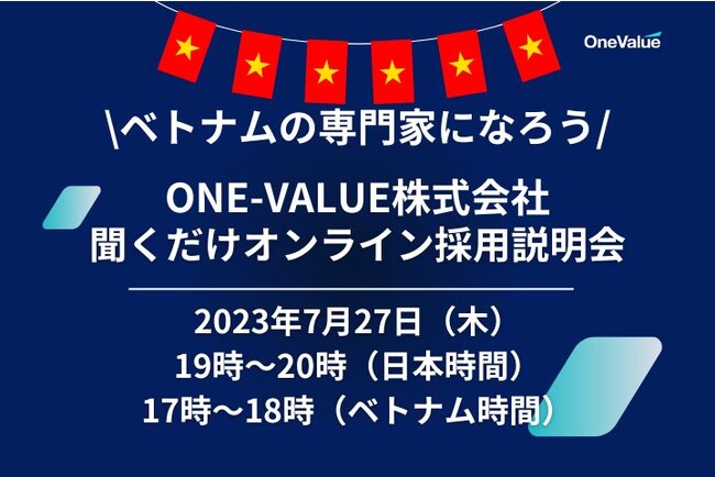 ベトナムに特化した経営コンサルティング企業であるONE-VALUE株式会社(東京都江東区、CEO:フィ ホア)は、オンライン採用説明会を2023年7月27日(木)の19時より開催します。