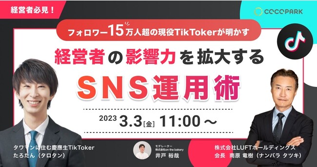 SNS運用・インフルエンサーPRのためのプラットフォーム「COCO PARK」と「インフルエンサーフォース」を運営する株式会社on the bakery(本社:神奈川県横浜市 代表取締役:井戸 裕哉)は、2023年3月3日(金)、COCO PARKゲストセミナー『【経営者必見】フォロワー15万人超の現役TikTokerが明かす〜経営者の影響力拡大のSNS運用術!!〜』を開催いたします。