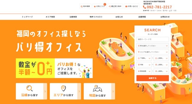 現在、福岡の中心部では「天神ビッグバン」と呼ばれる再開発プロジェクトが進行するなど、コロナ禍でもオフィス物件が供給され続けており、当社の「敷金半額くん」サービスによりお得に入居できる物件の数も増加しています。こうした背景のなか、日本商業不動産保証は物件を探している企業がそれぞれのニーズにあった最適な物件を「より探しやすく」「より見つけやすく」なることを目指し、この度福岡エリアでのオフィス仲介サービス「バリ得オフィス」のウェブサイトを全面リニューアルしました。