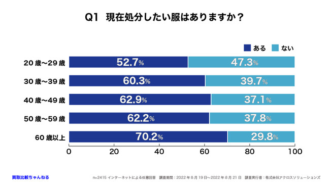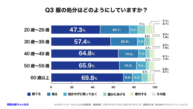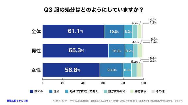 株式会社アクロスソリューションズと株式会社浜屋が共同運営している買取比較ちゃんねる(URL:https://www.hamaya-corp.co.jp/media )は、20歳以上の男女2415人を対象に「服の処分に関する性別や年代別の意識調査」を実施しました。