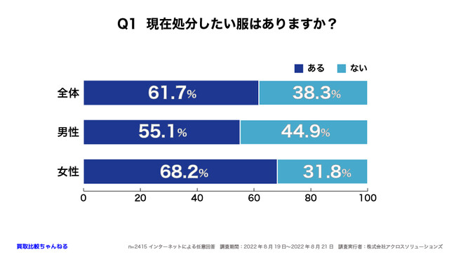 そこで、株式会社アクロスソリューションズと株式会社浜屋が共同運営している買取比較ちゃんねる(URL:https://www.hamaya-corp.co.jp/media )は、20歳以上の男女2415人を対象に「服の処分に関する性別や年代別の意識調査」を実施しました。