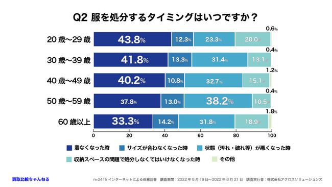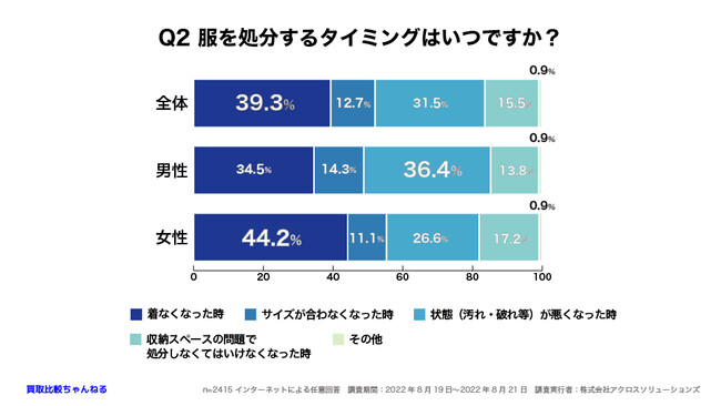 全体の結果では「着なくなった時」39.3%で一番多く、次いで「状態(汚れ・破れ等)が悪くなった時」で31.5%でした。