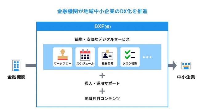DXFは、株式会社マネーフォワードが当金庫を通じて、顧客である中小企業向けに提供するDX推進ツールとしてのポータルで、コミュニケーションツール、ワークフロー、勤怠管理などのグループウェアをはじめとした日常業務に活用できるデジタルサービスが、簡単かつ直感的なUI/UXで搭載されています。IT担当者の不在などでDXが進んでいない企業でも簡単に、そして安価に利用することができ、業務のデジタル化の第一歩を進めていくことができるサービスです。
