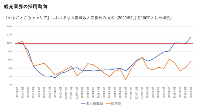インバウンド専門の求人サイト「やまとごころキャリア」の求人掲載件数は、新型コロナウイルス感染拡大の影響で、一時は2020年1月比で20%を切るまでに落ち込んだ。しかしながら今春以降は急激な回復を見せ、2022年9月にはコロナ前の水準を上回った。一方で、応募数は依然としてコロナ前の50%程度に留まっている。今回、当社が定期的に実施している当サイトの登録会員向けの「観光業界で働くことへの意識調査」の結果を報告するとともに考察をする。尚、本調査は岸田総理大臣が全国旅行支援の開催表明をする前に実施したものであることに留意頂きたい。