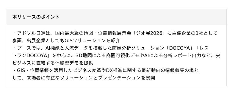 アドソル日進株式会社(本社:東京都港区、代表取締役社長 篠崎俊明、以下:アドソル日進)は、2026年4月28日に東京 ・大手町三井ホールにて開催される、地図・位置情報テクノロジーやプロダクトに関する国内最大級の展示会「ジオ展 2026」に主催企業の1社として参画し、あわせて当社独自のGISソリューションをご紹介するブースを出展しますので、お知らせします
