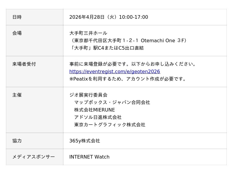 「ジオ展」は、マップボックス社、MIERUNE、東京カートグラフィック、アドソル日進という、それぞれ違った視点から地図や位置情報を活用したビジネスをリードする4社が実行委員会方式で企画・運営を行っています。