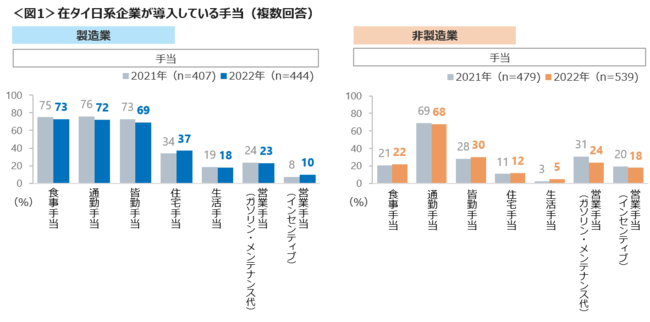 株式会社クロス・マーケティンググループ(本社:東京都新宿区、代表取締役社長兼CEO:五十嵐 幹)傘下の会社Kadence International (Thailand) Co., Ltd.(本社:タイ王国バンコク都 代表者 濱野 英和)とPERSONNEL CONSULTANT MANPOWER(THAILAND) Co., Ltd.(本社:タイ王国バンコク都 代表取締役小田原 靖)は、在タイ日系企業983社(製造業444社、非製造業539社)を対象に「在タイ日系企業調査(2022年)」を9月22日〜10月10日に実施し、給与、賞与、昇給率などを聴取しました。今回は、手当・福利厚生と今後の企業マネジメントに着目し分析しました。