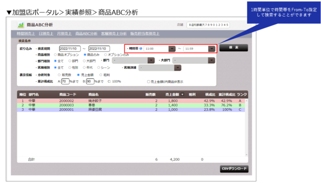 ABC分析画面で時間帯を指定して検索表示できるようになりました。