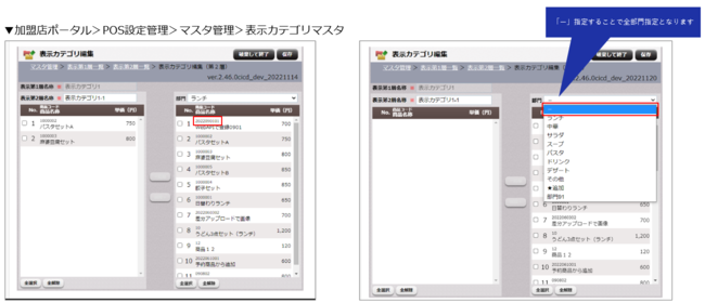 表示カテゴリマスタ画面で各商品の商品コードが表示されるようになりました。また、商品を表示する際に部門の全件指定ができるようになりました。これにより同一(類似)名称の商品やどの部門配下か分からない商品などの検索がしやすくなります。