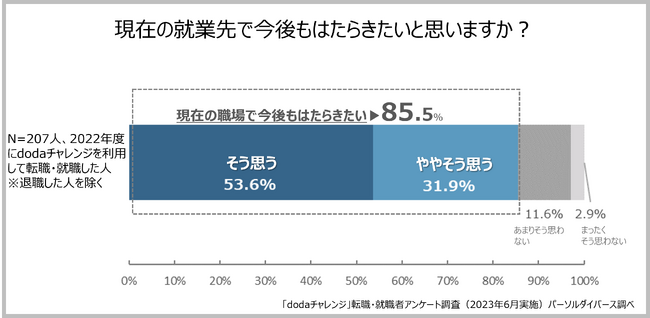 また85.5%の方が「現在の就業先で今後もはたらきたい」と考えており、入社先における継続的な就労意欲の高さが見られた。