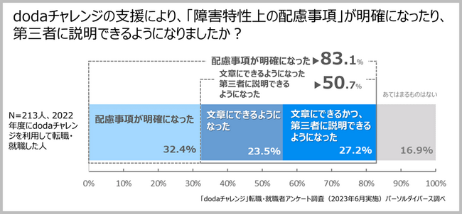 dodaチャレンジの支援により8割以上の方がご自身の「配慮事項が明確になった」と回答。