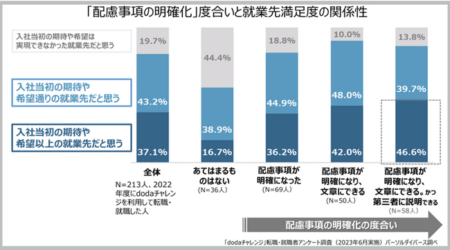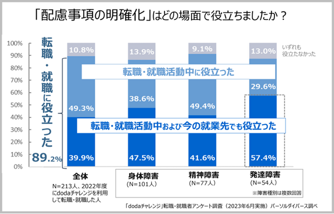 また、「配慮事項の明確化」が「転職・就職活動に役立った」が89.2%となり、高い割合に達した。障害別で比較すると発達障害のある方は、身体障害および精神障害のある方と比較すると、「今の就業先でも役立った」と感じる割合が大きい。