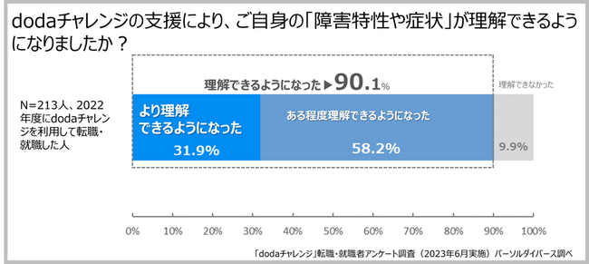 dodaチャレンジの支援により、9割の方がご自身の「障害特性や症状」を「理解できるようになった」(「より理解(31.9%)」「ある程度理解(58.2%)」)と回答。