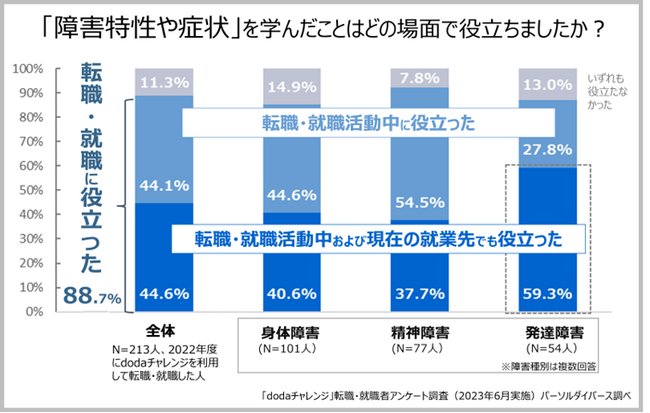 「障害特性の理解や症状の理解」することは、「転職・就職活動中に役立った」が88.7%と高い割合を示した。