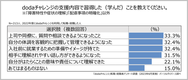 習得したと考える割合が大きい順に、「上司や同僚に、質問や相談ができるようになった」(33.3%)、「自分の体調を把握して管理できるようになった」(32.4%)、「就業前にはたらくイメージが持てた」(32.4%)、「相手に理解されやすい話し方ができるようになった」(31.5%)と回答があり、4つの項目で約3割を超えました。