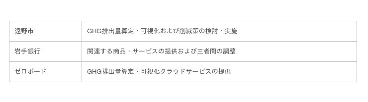 GHG(温室効果ガス)排出量算定・可視化クラウドサービス「zeroboard」を開発・提供する株式会社ゼロボード(本社:東京都港区、代表取締役:渡慶次 道隆、以下「当社」)は、2022年7月14日(木)、岩手銀行(代表取締役頭取:岩山 徹)と岩手県遠野市(市長:多田 一彦)との三者による、地域脱炭素の実現に向けた協定を締結いたしました。