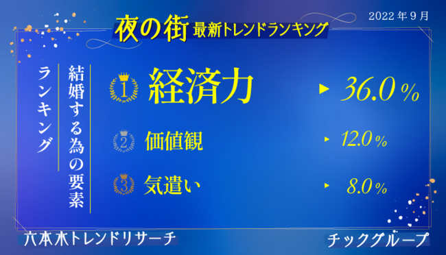 1位に挙げられた「経済力(36.0%)」は圧倒的となりましたが、「結婚となると経済面は安定してた方が心身共に穏やかな生活ができる」「自分がやりたいことをやるには経済力が必要だと思う」などといった意見があげられました。2位「価値観(12.0%)」については「お金も生活も何にお金使うかも価値観次第だから」「許せることと許せないことの価