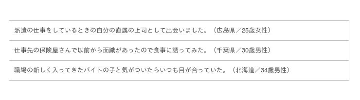 3位は意外にも「仕事上の関係」がランクインしています。仕事とひと夏の恋とは一見結びつきにくい気がしますが、夏の魔力のせいで急に男女の仲になるということもあるようです。