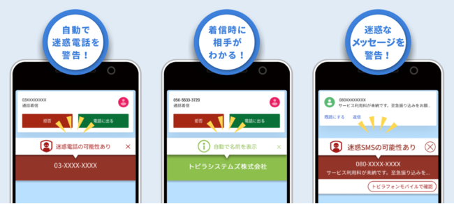 トビラシステムズでは、迷惑電話番号や迷惑URL、詐欺の文面パターン等を日々データベース化し、迷惑なSMSの受信時に自動で迷惑メッセージフォルダ振り分けや警告表示を行う迷惑SMS対策サービスを提供しています。当社の迷惑情報データベースを使用したモバイル向け各種迷惑情報フィルタサービスを、フィッシング詐欺や特殊詐欺の対策にぜひご活用ください。