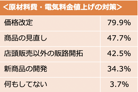 原材料費・電気料金の値上げに伴い、どんな対策をしているかという質問に対し、約80%が価格改定を実施したと回答。値上げ幅は5-10%UPという回答が最も多く、51.9%を占めました。商品の見直しや新商品の開発といった項目も割合が高く、直接仕入れで安く手に入る地元産の食材を取り入れたり、価格が安定している材料を使った商品開発なども挙がりました。