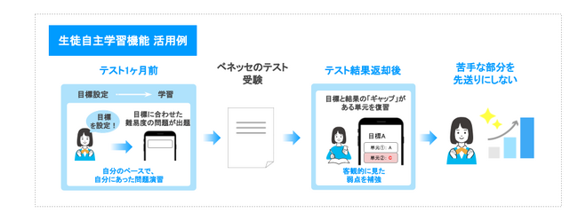 生徒自身が目標設定を行い、ベネッセのテスト(※2)を受けることで弱点単元を明確化します。生徒は自らの得意・不得意領域を理解し、強化したい単元を選択しながら学習を進めることが可能となります。