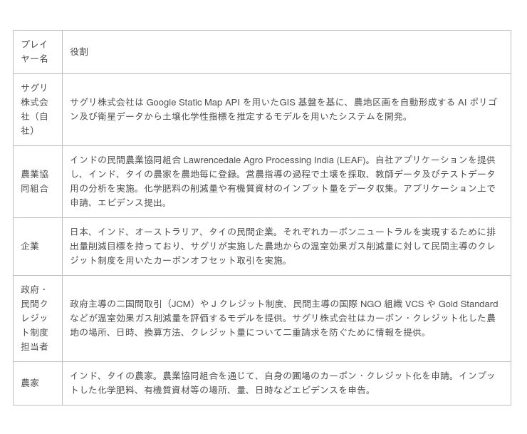 本事業は、我が国が化学肥料の多くを輸入に依存している状況下で、他国の輸出規制やロシア-ウクライナ情勢による世界的な化学肥料価額高騰に伴い、調達コストが増加しつつあることを背景にしています。そのような状況下においても、我が国が掲げる温室効果ガス削減目標を達成するため、脱炭素社会の実現に資する迅速な技術輸出や、排出取引に向けた関係構築を行う必要があります。本事業においては、サグリ株式会社は衛星データと機械学習を用いた農地自動区画化及び土壌中の窒素量を評価し、農地での最適な施肥設計によるN2O(亜酸化窒素)の排出量を削減します。そして、民間主導で、削減量評価、カーボンクレジット化を実施します。具体的には、インド・タイの圃場において、化学肥料を削減し、削減した分の肥料に応じた温室効果ガス削減量を算定し、それらの温室効果ガス削減量をカーボンオフセット取引に資するデータであるかどうかを、民間主導のクレジット制度に基づいて評価します。評価に基づき、農業由来の温室効果額削減量データがインド・タイ・オーストラリア・日本の各国企業にとってカーボンオフセット取引になりえるかを確認します。