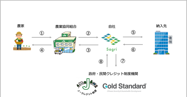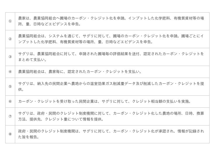 当社は、農業協同組合に開発したシステムを展開し、農業協同組合はそのシステムから得られる営農情報を用いて農家を管理し、営農指導者が、農家の管理や最適な営農情報・営農資材の提供を実施します。また、営農指導者は圃場や顧客管理システムを用いて、各圃場・農家のデータなどを入力するとともに、一部の圃場で実施した土壌分析データを緯度経度ごとに入力します。これらの情報はサグリ株式会社が提供する衛星データによる土壌化学性評価の教師データやテストデータに生かされるため、高精度な土壌分析データを基に、農家が圃場ごとに最適な施肥設計を行うことで、使用する化学肥料の削減や有機質資材の活用を促進するとともに、それらの活動によって農家から申告された農地毎の温室効果ガスの吸収量を評価し、カーボン・クレジット化を行うことができます。