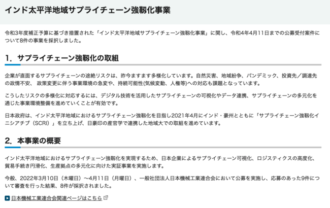 新型コロナウィルスがもたらす生産要素の移動に関する様々な制約と産業構造の変化、気候変動による自然災害の増加、米中間の覇権争いによる貿易・技術・投資・人の移動における様々な規制と障壁等に加え、こうした変化と並行して第4次産業革命に代表される経済のデジタル化とサービス化は猛烈な速度で進行し、脱炭素に向けた厳しい要請が行われるなど、サプライチェーンを取り巻く環境は大きく変動し、途絶リスクも増大しています。これに対応するため、経済産業省では、デジタル技術を活用したリスクの可視化やデータ連携、新たな拠点をサプライチェーンに組み入れるための事業環境整備を進めていくこととし、インド太平洋地域におけるサプライチェーン強靱化を実現するための事業者の取組(サプライチェーン可視化、ロジスティク スの高度化、貿易手続き円滑化及び生産拠点の多元化に向けた実証、事業実施可能性調査又は人材育成等)に対して、経費の一部を補助することにより、令和3年度補正 海外市場調査等事業費補助金(インド太平洋地域サプライチェーン強靱化事業)に係る補助事業(以下、本事業)を実施することとなりました。(日本機械工業連合会ホームページ:http://www.jmf.or.jp/intro/iinkai/2914.html より引用。)