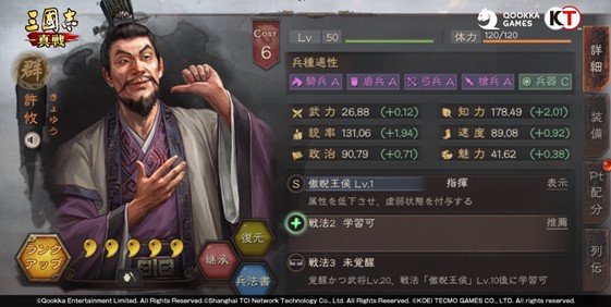 「許攸」——字は子遠。若い頃は曹操、袁紹らとの仲が良かったが、袁紹勢力に仕えた間、派閥闘争の犠牲となり、曹操に身を寄せました。固有戦法の傲睨王侯は敵軍の間隙を15個見抜きます。間隙は敵軍全体に分散しており、味方の通常攻撃で間隙を触発させると、戦闘終了まで継続する基本属性低減のデバフを該当敵軍に付与することができます。敵軍単体の間隙が全て触発された場合、その敵軍は1ターン持続の虚弱状態になり、被ダメージが大幅に増加します。全ての間隙が触発された後、許攸は更に敵軍複数(2人)の基本属性を削ります。
