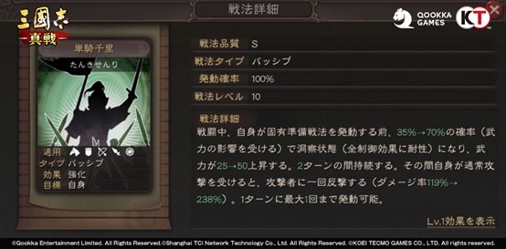関羽が単騎で千里を走り、劉備の元に戻る典故から由来するパッシブ戦法です。戦闘中、固有準備戦法を発動する前、一定の確率で洞察状態を獲得し、武力を増加させます(2ターン持続)。この期間中、1ターンに1度、通常攻撃を受けた時、攻撃者に反撃します。