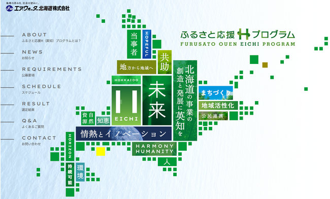 なお、本寄付支援制度「ふるさと応援H(英知)プログラム」の名称のHには、HOKKAIDO(北海道)、HOPEFUL(希望)、HUMANITY(人間性)、HARMONY(調和)、HORIZON(地平線)の意と、エア・ウォーターグループの経営理念「創業者精神をもって 空気、水、そして地球に関わる事業の創造と発展に『英知』を結集する」が込められています。