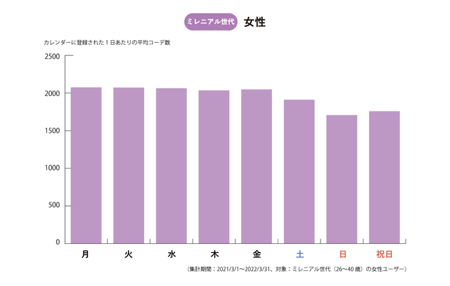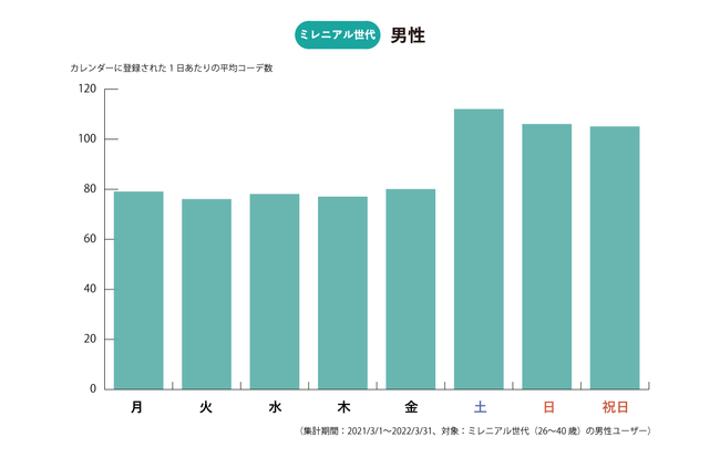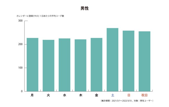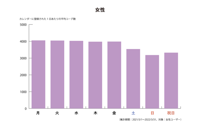 カレンダーに登録されたコーディネートを分析すると、女性ユーザー・男性ユーザーでどの曜日のコーディネートを重視しているかが見えてきました。女性の場合はとくに「平日」、男性の場合はとくに「土日祝日」のコーディネートを記録していることが分かり、男女でコーディネートを重視する曜日が異なっていることが分かりました。